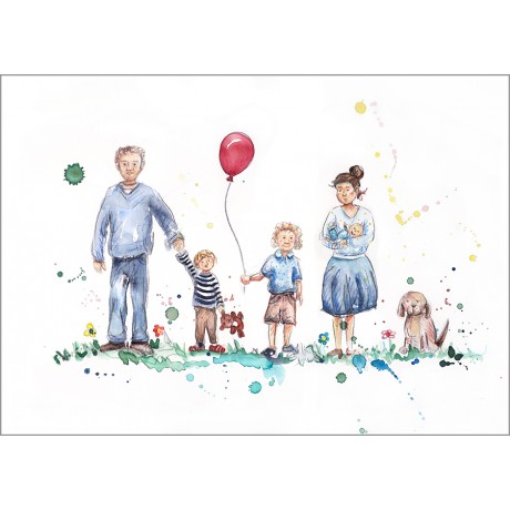 Es werden Frisuren, Haarfarbe und weitere Details wie zB. Brille, Bart, Kuscheltier und Haustier, mit Aquarellfarbe, von mir direkt auf den Druck gemalt, um den Wiedererkennungswert Ihrer Familie herzustellen.